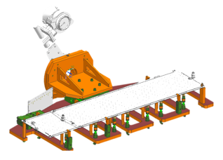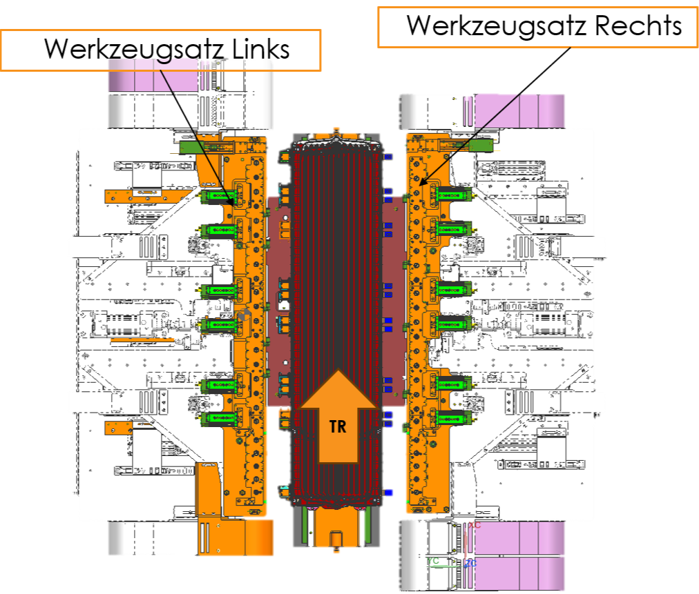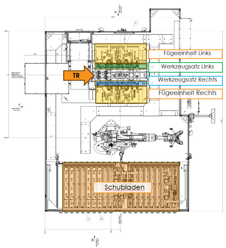 Der Greifer legt die zwei entnommenen Insulation Covers auf zwei Werkzeugsätze, die sich auf der Fügeeinheit befinden. Die Fügeeinheit klappt die Werkzeugsätze um 90 Grad und drückt sie an die Batterie.