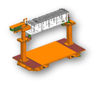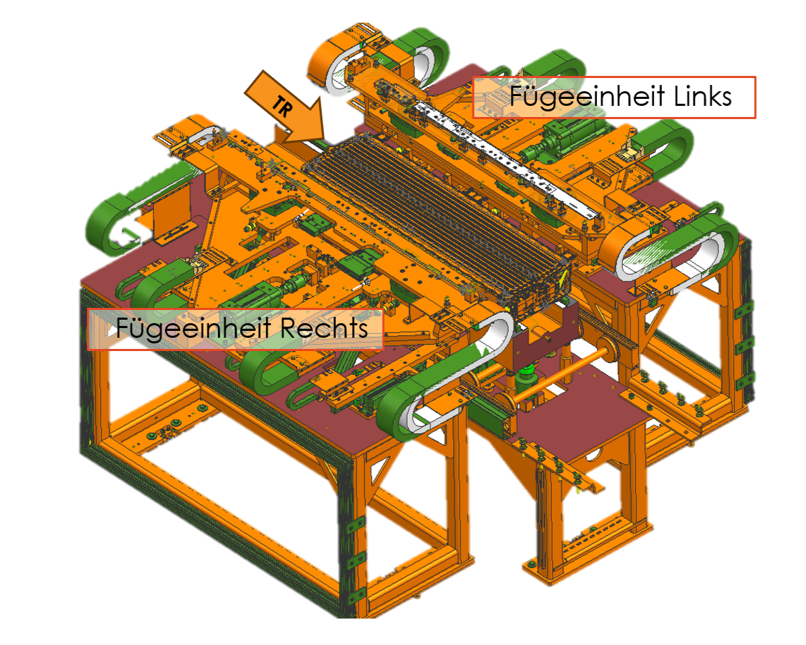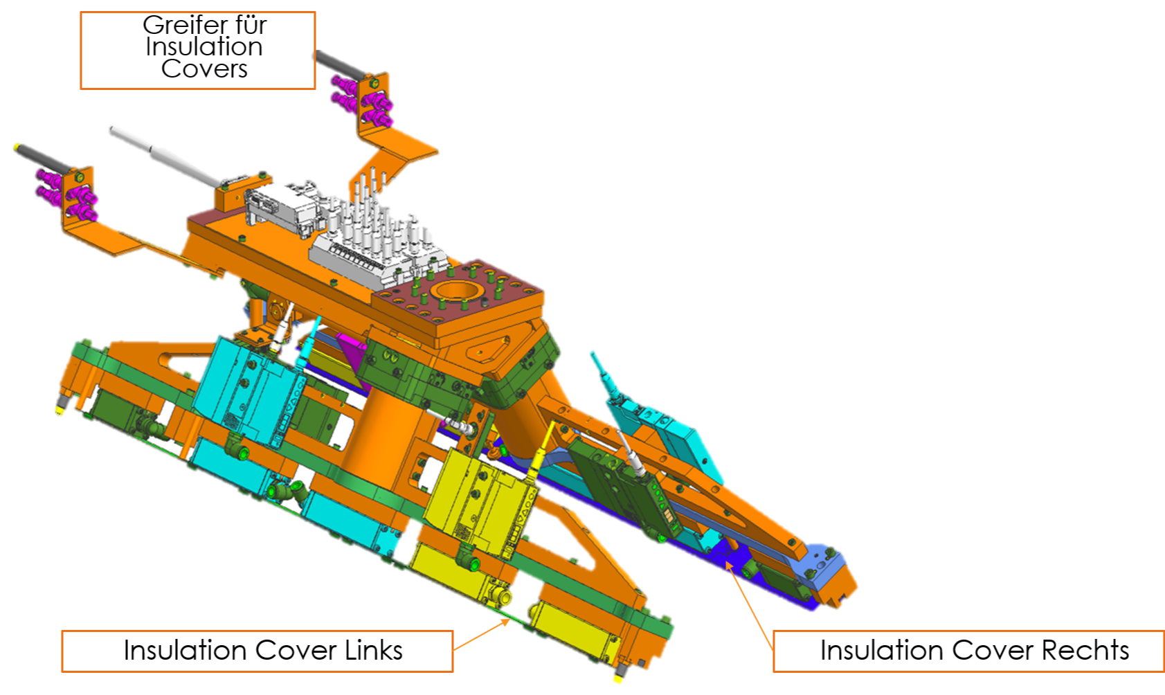 Der Greifer legt die zwei entnommenen Insulation Covers auf zwei Werkzeugsätze, die sich auf der Fügeeinheit befinden. Die Fügeeinheit klappt die Werkzeugsätze um 90 Grad und drückt sie an die Batterie.