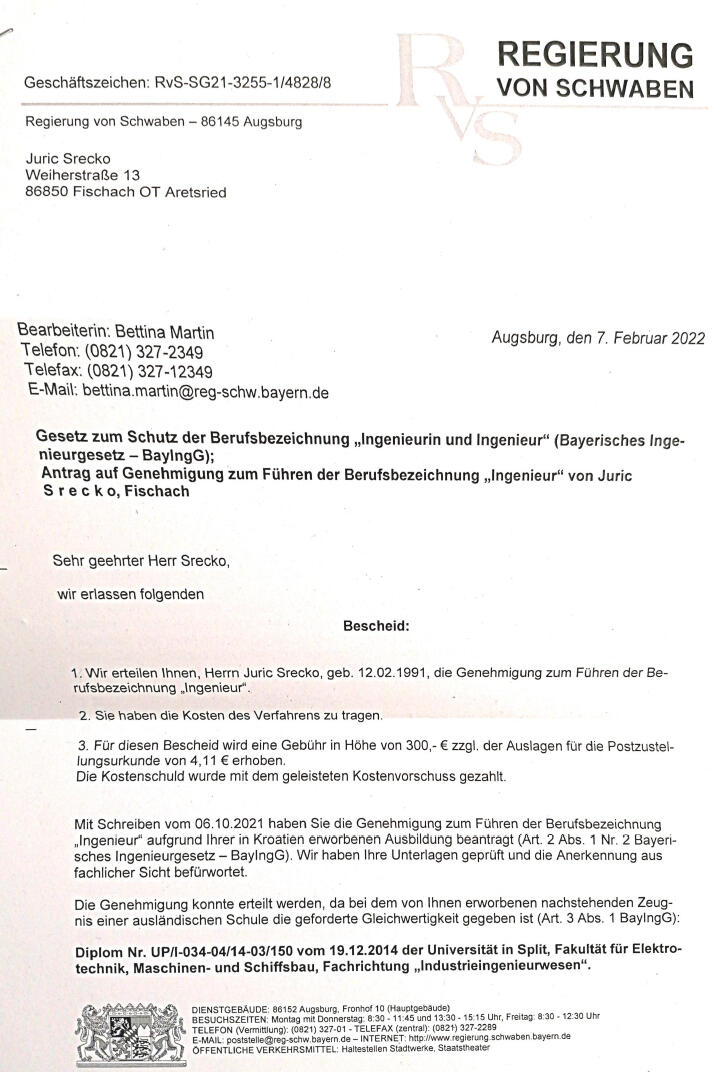 Bescheid der Regierung von Schwaben über die Genehmigung zum Führen der Berufsbezeichnung ‚Ingenieur‘